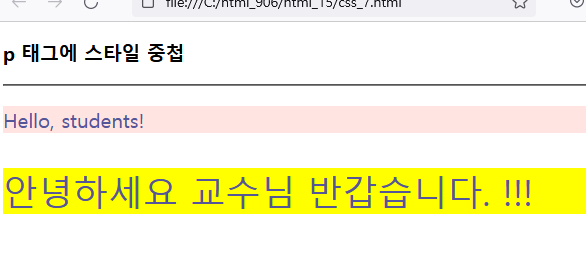 이 방법은 HTML 문서 안의 여러 요소를 한번에 꾸밀 수 있다는 장점이 있으나, 또 다른 HTML 문서에는 적용할 수 없다는 단점이 있다. (한 문서안에서만 사용)