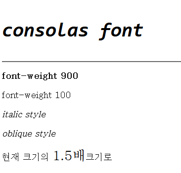 | consolas | 문자별 특징을 명확히 하여 구별이 쉬움 : 개발자가 사용하기 좋은 폰트 |