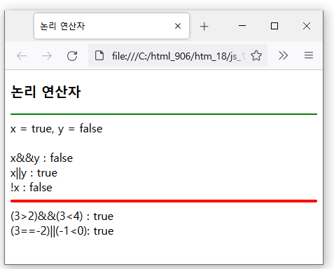 document.write("(3>2)&&(3<4) : " + ((3 > 2) && (3 < 4)) + "<br>");
