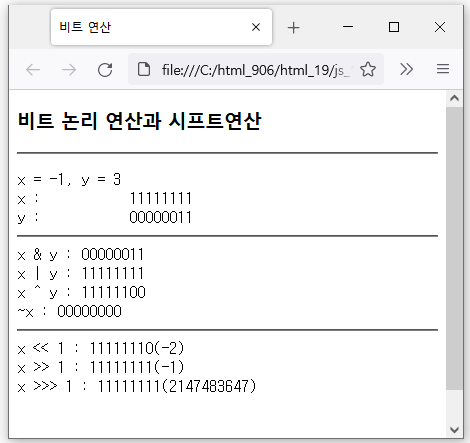 document.write("~x : " + digit8(~x) + "<br>"); // 1과 0을 바꿈