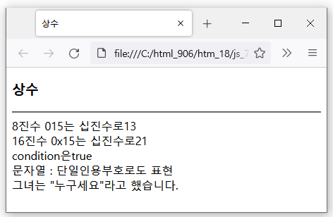 document.write("16진수 0x15는 십진수로"+hex+"<br>");