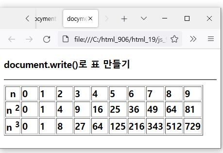 document.write("<h3>document.write()로 표 만들기<h3>");