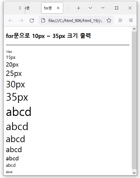 <h3> for문으로 10px ~ 35px 크기 출력</h3>