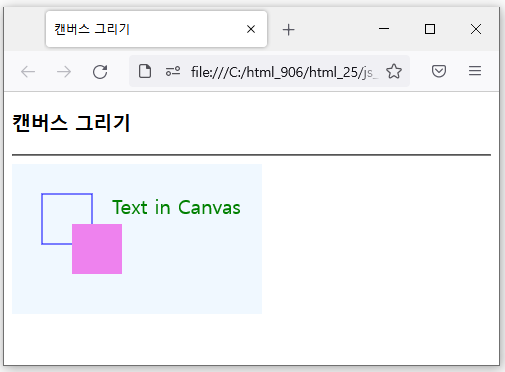 context.fillText("Text in Canvas", 100, 50); // 택스트를 경로에 넣지 않고 바로 그리기
