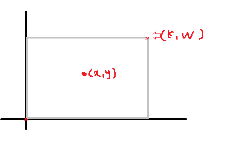 문제 한수는 지금 (x, y)에 있다. 직사각형은 각 변이 좌표축에 평행하고, 왼쪽 아래 꼭짓점은 (0, 0), 오른쪽 위 꼭짓점은 (w, h)에 있다. 직사각형의 경계선까지 가는 거리의 최솟값을 구하는 프로그램을 작성하시오. 입력 첫째 줄에 x, y, w, h가 주어진다. 출력 첫째 줄에 문제의 정답을 출력한다. 제한 1 ≤ w, h ≤ 1,000 1 ≤ x ≤ w-1 1 ≤ y ≤ h-1 x, y, w, h는 정수 (구상) 좌표축을 생각했을때 다음과 같은 형태로 좌표가 존재한다고 생각하자. 그러면 최단거리는 점(x,y)가 x축가 만나는 거리 , y축과 만나는거리, 직사각형의 나머지 가로 또는 세로와 만나는 거리를 고려해 주면 된다. 이들 네가지를 구하여 최솟값을 출력해 주면 된다. 1.x축과의 거리 ..