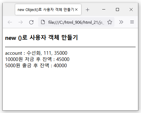 개발자는 Array, String, Date등 자바스크립트에서 제공하는 코어 객체(내장 객체) 외에 새로운 타입의 객체를 만들어 사용할 수 있다. 개발자가 선언하는 새로운 객체 타입을 prototype(프로토타입)이라고 부른다. new Object() 로 객체 만들기 자바스크립트 코어 객체 중 Object 타입을 이용하면 사용자 객체를 만들 수 있다. [ 여러가지 방법으로 사용자 객체 생성해보기 ] ✔ new 방법으로 사용자 객체 만들기 new ✔ 리터럴 방법으로 사용자 객체 생성 리터럴 표기법으로 사용자 객체 만들기 결과는 동일하다. ✔ 프로토 타입 만들기 (자바와 유사) Account 프로토타입 만들기 다른 예제들 프로토 타입 Test book 객체 만들기
